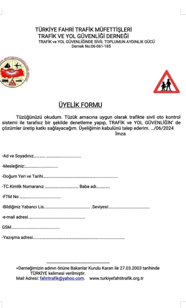 İletişim E-posta: fahritrafik@yahoo.com IBAN numaramız: TR25 0006 4000 0014 2184 1979 79Hesap Adı: Türkiye Fahri Trafik Müfettişleri Derneği ÜYE KAYIT FORMU